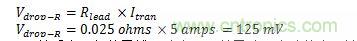 以一個(gè)具有25A供電,伴有5A瞬變電流的負(fù)載應(yīng)用為例。其中,電源電壓設(shè)為 2.5V,通過(guò)5英尺長(zhǎng)的14AWG布線(xiàn)連接至IC測(cè)試板。由于是低電壓供電,如果電壓有超過(guò)100mV的跌落,通常是不可接受的。14AWG線(xiàn)每英尺的電阻為2.5mΩ,由此,在電源輸出和IC測(cè)試板之間的導(dǎo)線(xiàn)回路存在25mΩ電阻。根據(jù)歐姆定律,我們可以計(jì)算出導(dǎo)向回路上可能出現(xiàn)的壓降: