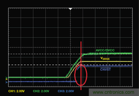 在所有電源均完全建立之前,不得切換數字引腳。對于SAR ADC,轉換開始引腳CNVST 可能對噪聲敏感。在圖1 所示示例中,當AVCC、DVCC 和VDRIVE 仍在上升時,主機cPLD 拉高CNVST。這可能使 AD7367 進入未知狀態(tài),因此,在電源完全建立之前,主機應使 CNVST 保持低電平。