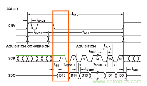 ADI 公司帶SPI 接口的許多SAR ADC 都是從 CS 或CNV 的下降沿為MSB 提供時鐘信號,剩余的數據位則跟隨SCLK 的下降沿,如圖3 所示。在讀取MSB 數據時,要使用等式中的tEN 而非tDRV。