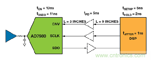 在圖4 中,DSP 主機訪問 AD7980 處于3 線 CS 模式下,其中,VIO = 3.3 V。DSP 鎖存SCLK 下降沿上的SDO 信號。DSP 的額定最小建立時間為5 ns,最小保持時間為2 ns。對于典型的FR-4PCB 板,傳播延遲約為180 ps/in。緩沖器的傳播延遲為5 ns。CNV、SCLK 和SDO 的總傳播延遲為
