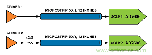 在圖7 中,一個驅動器通過一條12 英寸的微帶線路連接SCLK1,另一個驅動器通過一個與微帶串聯(lián)的43 Ω 電阻連接SCLK2。