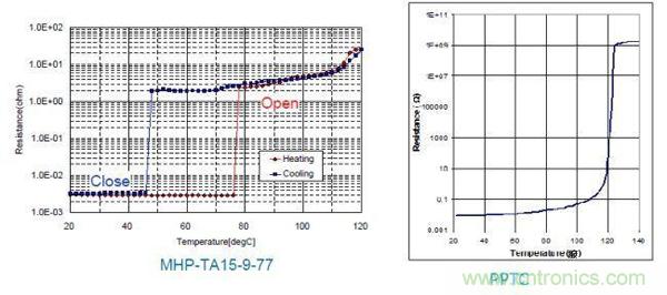 因此,不論哪種方式的快速充電,都是通過提高充電電流或功率來加速鋰電池芯內(nèi)部的反應(yīng)來實現(xiàn)的,必須通過更多的保護(hù)來防止由于電池芯的熱失控而引起的起火甚至爆炸。TE的PPTC和MHP-TA 可以有效地提供這種保護(hù),MHP-TA是結(jié)合了雙金屬片和PPTC的溫度/電流保護(hù)器件,溫度保護(hù)更加精確,可以適用于電流較大、溫度保護(hù)要求更高的電子設(shè)備,如:智能手機(jī)、平板電腦、超級本、筆記本電腦等。MHP-TA及PPTC的特性及應(yīng)用如下圖,緊貼電池芯的設(shè)計可以使MHP-TA和PPTC更好的感測電池溫度,當(dāng)電池溫度異常升高時可以呈現(xiàn)高阻,阻礙電池的充放電電流,確保電池的安全使用。