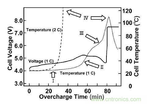 下圖是鋰離子電池過充電測試的一個事例??梢钥闯龀潆娺^程中鋰離子電池芯內(nèi)部溫度和電壓的變化情況,正常1C充電時,電池芯的溫度隨恒流充電慢慢升高,而隨恒壓階段電流減小慢慢降低,整個過程溫度可控,安全。當(dāng)大電流(2C或以上)時,電池芯內(nèi)部反應(yīng)劇烈發(fā)生熱失控,溫度急劇升高而發(fā)生起火或爆炸。