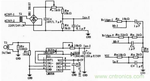 對(duì)于輸出電流取樣,本設(shè)計(jì)中使用了5 A/5 mA電流互感器。由于電流互感器的輸出為毫伏級(jí)的交流信號(hào),為了能夠被單片機(jī)內(nèi)部AD模塊采集到,必須將其整流成直流信號(hào)并加以放大。而普通二極管整流電路對(duì)毫伏級(jí)電壓是無(wú)效的,因此,此處采用了由運(yùn)算放大器(U11,LM3 58)構(gòu)成的小電壓整流電路。實(shí)際測(cè)試表明,該電路有效解決了毫伏級(jí)信號(hào)的采樣問(wèn)題。