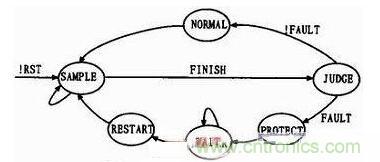 為了提高系統(tǒng)的可讀性以及代碼效率,軟件采用狀態(tài)機(jī)思想設(shè)計(jì),圖5所示為系統(tǒng)的狀態(tài)轉(zhuǎn)換圖。系統(tǒng)上電復(fù)位后進(jìn)入SAMPLE采樣狀態(tài),若檢測(cè)到采樣完成標(biāo)志FINISH則進(jìn)入JUDGE狀態(tài)進(jìn)行判斷,如果FAULT不為0即有故障信號(hào)(過(guò)壓/欠壓、過(guò)載、短路),則進(jìn)入PROTECT狀態(tài)關(guān)閉輸出,并跳轉(zhuǎn)到WAIT狀態(tài)等待故障信號(hào)消除。當(dāng)故障信號(hào)消除后,系統(tǒng)軟重啟,開(kāi)始新的采樣及檢測(cè)。JUDGE狀態(tài)后如果未檢測(cè)到故障信號(hào),則進(jìn)入NORMAL正常狀態(tài),進(jìn)行電壓調(diào)整。