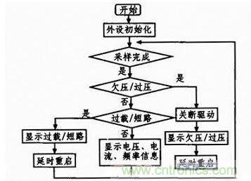 系統(tǒng)上電后,首先完成各個(gè)外設(shè)的初始化,主要包括系統(tǒng)時(shí)鐘、定時(shí)器、GPIO口、ADC、DMA、中斷及SPI的初始化。在此,定時(shí)器和中斷一旦初始化完成,PWM及SPWM波就會(huì)生成??紤]到過(guò)流、短路保護(hù)及反饋穩(wěn)壓的實(shí)時(shí)性要求較高,故在中斷內(nèi)完成。欠壓、過(guò)壓對(duì)實(shí)時(shí)性要求低,放在主程序內(nèi)。為提升系統(tǒng)的性能,ADC采樣使用DMA方式傳輸數(shù)據(jù),傳輸完成后,發(fā)出中斷申請(qǐng),對(duì)采集到的數(shù)據(jù)進(jìn)行簡(jiǎn)單濾波處理,其他功能函數(shù)調(diào)用此數(shù)據(jù)完成相應(yīng)的保護(hù)及穩(wěn)壓功能。主程序的流程圖如圖6所示。