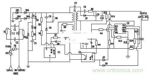 電源的核心部分采用反激式變換器,結構簡單,易于實現(xiàn)。整體設計電路圖如圖1.