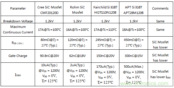 目前市面上常見的SiC Mosfet電流均不大于50A,以常見的1200V/20A為例,列舉了Cree公司與Rohm公司的SiC Mosfet管的部分電氣參數(shù);同樣例舉了Fairchild 與APT公司的1200V/20A Si IGBT系列的電氣參數(shù)進行比較;