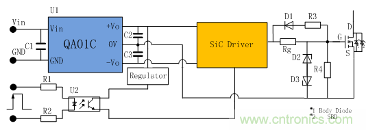 QA01C具有完整的驅(qū)動電路推薦,通過SiC驅(qū)動專用電源得到不對稱的正向驅(qū)動電壓20V,負向偏置關(guān)斷電壓-4V;為了防止驅(qū)動電壓對柵極造成損壞,增加D2和D3來吸收尖峰電壓是很有必要的。SiC驅(qū)動器采用一般驅(qū)動芯片即可;為了實現(xiàn)控制信號與主功率回路的隔離,需要采取隔離措施,推薦采用常見的光耦隔離方案。采用的光耦必須具有高共模抑制比(30KV/us)和比隔離電源大的隔離耐壓并且具有極小的延遲時間來適應(yīng)SiC Mosfet管的高頻率工作特性。