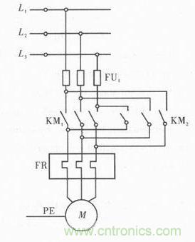 在眾多的操作系統(tǒng)中均要求電動機(jī)能夠?qū)崿F(xiàn)正反轉(zhuǎn)給操作,從電動機(jī)的工做原理中可知,需將三相電源中的任意兩個進(jìn)行對調(diào),就能實(shí)現(xiàn)電動機(jī)的反向運(yùn)轉(zhuǎn),因此電動機(jī)實(shí)現(xiàn)正反轉(zhuǎn)的實(shí)質(zhì)便是電源進(jìn)線的調(diào)換。但若僅調(diào)換進(jìn)線,容易導(dǎo)致電源短路,因此必須設(shè)置互鎖,圖2是三相異步電動機(jī)正反轉(zhuǎn)的原理設(shè)計圖,圖中KM1和KM2均是交流接觸器主觸頭,當(dāng)KM1吸合時,KM2交流接觸器主觸頭就會斷開,然后便可實(shí)現(xiàn)電機(jī)的正轉(zhuǎn)。若是斷開交流接觸器主觸頭KM1,KM2就會吸合,此時電動機(jī)則會實(shí)現(xiàn)反轉(zhuǎn),圖中的FU1主要用于防止電源短路,圓形代表電機(jī)M。