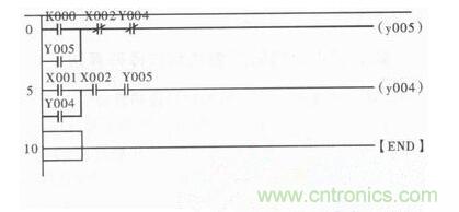 在圖3梯形圖中,PLC外部按鈕所控制的常開觸點(diǎn)主要是左母線的第一等級以及第二等級的X001觸點(diǎn)和X002觸點(diǎn),只需按鈕便可使得X000或X001任意一個常開觸點(diǎn)閉合,輸出繼電器Y005或繼電器Y004就能通過相應(yīng)線路形成閉合回路,進(jìn)而使常開接觸點(diǎn)Y005或Y004實(shí)現(xiàn)自鎖功能同時實(shí)現(xiàn)電動機(jī)的正反轉(zhuǎn)。停止通過PLC外部的按鈕實(shí)現(xiàn),按鈕通過釋放X002常開接觸點(diǎn),使得繼電器斷電引發(fā)電動機(jī)停止運(yùn)轉(zhuǎn)。