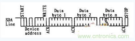 如果主設(shè)備要向EEPROM中寫數(shù)據(jù),在地址字節(jié)中主設(shè)備向EEPROM發(fā)出一個寫請求(R/W=0),發(fā)送的地址字節(jié)之后緊跟著要發(fā)送的數(shù)據(jù)。每發(fā)送一個字節(jié)的數(shù)據(jù)后EEPROM就會產(chǎn)生一個應(yīng)答信號,主設(shè)備也會監(jiān)控應(yīng)答信號,如果在發(fā)送一個字節(jié)后EEPROM沒有返回應(yīng)答信號,則主設(shè)備就會停止發(fā)送,并生成一個結(jié)束信號。寫操作的時序如圖3所示。