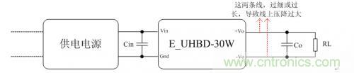 根據(jù)數(shù)據(jù)手冊(cè)要求連接E2405UHBD-30W電源模塊外圍電路,負(fù)載使用電子負(fù)載儀加滿載,供電電源使用可編程直流電源。模塊上電,電子負(fù)載儀上顯示的電壓值不是5.0V,而是4.7V,然而在測(cè)量電源模塊輸出引腳兩端的電壓值是5.0V。什么原因呢?E2405UHBD-30W模塊滿載時(shí),輸出電流有6A,而模塊引腳到負(fù)載儀端口之間的連接線太長了,使得連接線的阻抗值大。如果阻抗為0.05歐姆,那么連接線上的電壓差為0.05Ω*6A=0.3V,這個(gè)就是模塊輸出引腳到負(fù)載儀端口的壓差。