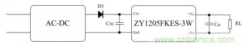 AC-DC電源模塊輸出電壓為12V,最大輸出電壓精度為±3%,那么輸出電壓范圍是11.64V~12.36V。而二極管D1使用1N4148,正向?qū)▔航禐?.7V,那么ZY1205FKES-3W模塊實(shí)際輸入電壓的范圍只有為10.94V~11.66V,這個(gè)電壓范圍還是在ZY1205FKES-3W模塊的輸入電壓范圍內(nèi),模塊可以正常工作,只是輸出電壓會(huì)較低。