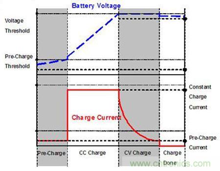 因鋰離子電池的特性,若鋰離子電池在充電之前已深度放電,此時(shí)充電器會(huì)先以微弱電流對電池進(jìn)行Pre-Charge充電(各家廠商設(shè)定值不同,本文使用范例的充電IC設(shè)定值約為10%的最大充電電流),充電時(shí)電池電壓上升。