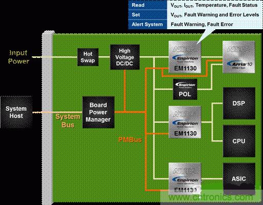 (2)另一常見的系統(tǒng)電源要求是能夠進行遠程監(jiān)視,對電源各參數(shù)進行實時監(jiān)視、故障報警和相應調節(jié)。而最簡單、最便宜、最緊湊的方式是使用集成了遠程監(jiān)視功能和相應的通信總線的電源調節(jié)器。通過智能電壓ID(SmartVID)特性,Altera的Arria 10 FPGA和SoC通過PMBus接口,確定與Enpirion電壓調節(jié)器系統(tǒng)之間所需的VCC電壓和通信,將內核電壓軌盡可能動態(tài)調整到最小,而不會犧牲系統(tǒng)性能。同時,支持PMBus的Enpirion的ED8101P0xQI單相數(shù)字控制器,與ET4040QI大電流電源配對使用,可實現(xiàn)對FPGA的多種遠程監(jiān)視和低功耗特性。