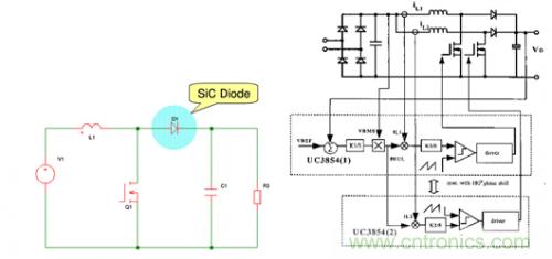 因為SiC器件的特性,SiC二極管的反向恢復(fù)時間接近0,因此開關(guān)損耗很低。將SiC用于PFC中可以帶來的好處是:高頻化、在較高的開關(guān)頻率下依然可以得到較低的開關(guān)損耗,電感的體積可以減小,同時還提高了功率密度。