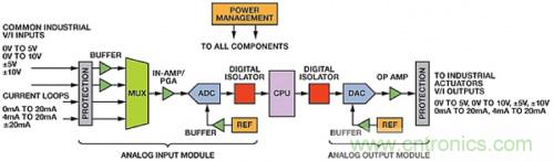 典型模擬I/O模塊包括2個、4個、8個或16個通道。為滿足嚴格行業(yè)標準,這些模塊需要提供過壓、過流和EMI浪涌保護。大多數(shù)PLC包括ADC和CPU之間、CPU和DAC之間的數(shù)字隔離。高端PLC可能還有國際電工委員會(IEC)標準規(guī)定的通道間隔離。 很多I/O模塊包括每通道軟件可編程單端或差分輸入范圍、帶寬和吞吐率。