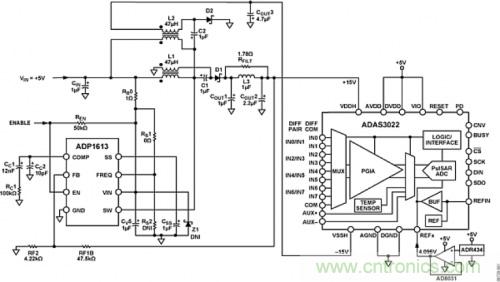 ADP1613用作單端初級原邊電感(SEPIC) Cuk轉(zhuǎn)換器,是ADAS3022在外部5 V電源供電情況下,為其提供20 mA時所需±15 V高壓電源以及最大值為3 mV的低輸出紋波的理想選擇。本應用中,ADP1613的開關(guān)頻率為1.3MHz。如圖3所示,ADP1613盡可能地減少了外部元器件數(shù)目,并且具有超過86%的效率,因此它能滿足ADAS3022的規(guī)格要求。在該拓撲中使用低成本ADP1613的最大優(yōu)勢,是它在兩條供電軌之間的出色跟蹤能力,同時使用現(xiàn)成的耦合電感可產(chǎn)生±15 V電壓。除此之外,還能通過ADIsimPower設(shè)計工具輕松快捷地完成設(shè)計制造。
