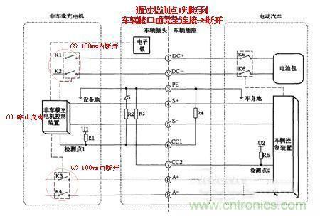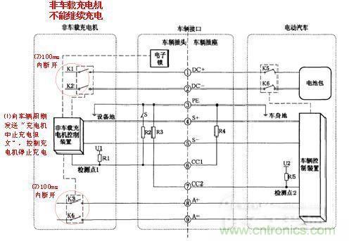 2)在充電過程中,非車載充電機控制裝置通過對檢測點1的電壓進(jìn)行檢測,如果判斷車輛接口由完全連接變?yōu)閿嚅_(如車輛意外移動、充電槍線纜被意外擾動等),則控制非車載充電機停止充電,應(yīng)在100ms內(nèi)斷開K1、K2、K3、K4。