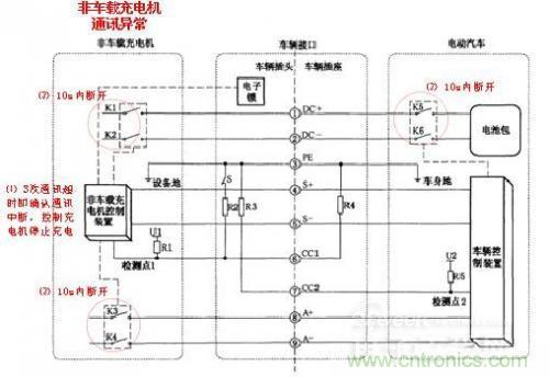 2)在充電過程中,非車載充電機控制裝置如發(fā)生通訊超時(如通訊線路故障等),則非車載充電機停止充電,并在10s內(nèi)斷開K1、K2、K5、K6,非車載充電機控制裝置發(fā)生3次通訊超時即確認(rèn)通訊中斷,則非車載充電機停止充電,并在10s內(nèi)斷開K1、K2、K3、K4、K5、K6;