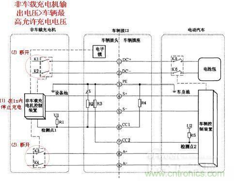 1)在充電過程中,非車載充電機控制裝置通過對檢測點1的電壓進(jìn)行檢測,如果判斷開關(guān)S由閉合變?yōu)閿嚅_(如充電槍上按鍵失靈或誤觸發(fā)等),應(yīng)在50ms內(nèi)將輸出電流降至5A或以下;