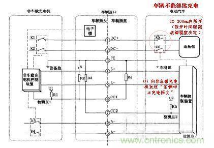 1)在充電過程中,如果車輛出現(xiàn)不能繼續(xù)充電的故障(如BMS系統(tǒng)誤報電池實時狀態(tài)、車輛控制裝置誤關(guān)斷充電回路接觸器等),則向非車載充電機發(fā)送“車輛中止充電報文”,并在300ms(由車輛根據(jù)故障嚴(yán)重程度決定)內(nèi)斷開K5和K6。