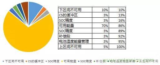 首先,我們考慮一下能量分配,在SOC從整個100%到零或者說整個電池能量管理過程可以分解為:上下兩段留存的不可用能量(純電動汽車上下留余更多一些)、可用能量、SOC誤差、調(diào)節(jié)電池溫度所需要的能量、容量下降的補償、插電式混合動力汽車的CS緩沖區(qū)(純電動沒有這段)。