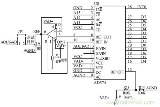 A/ D 采樣輸入電路如圖4 所示。為了滿足取樣精度需要,我們選擇12 bit A/ D 轉(zhuǎn)換器和12 bitD/ A 轉(zhuǎn)換器,使步進小于1 mA,在電路中A/ D 啟動后,先讀高8 位結(jié)果,再讀后4 bit;D/ A 是先寫入高8 bit,再寫入低4 bit.