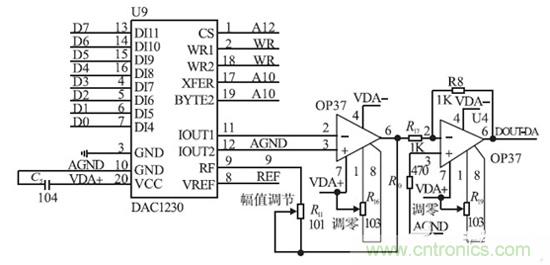 D/ A 控制輸出電路如圖5 所示。該單片機的輸入信號為經(jīng)過12 bit 的A/ D 轉(zhuǎn)換器的數(shù)字量,送入單片機處理后產(chǎn)生輸出數(shù)字量經(jīng)D/ A 轉(zhuǎn)換后送入恒流源,因而這種數(shù)控恒流源的精度最終取決與電路中A/ D 和D/ A 轉(zhuǎn)換器的轉(zhuǎn)換精度。