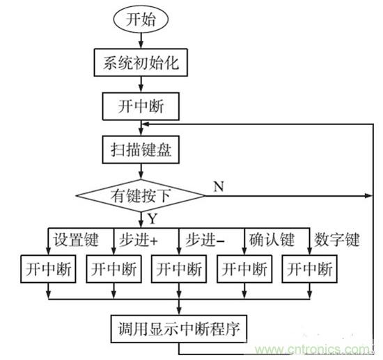 采用數(shù)字控制策略比模擬控制的有無可比擬的優(yōu)勢:實現(xiàn)不同的控制算法;數(shù)字PID 具有設(shè)計周期短,調(diào)試和升級方便。數(shù)字控制系統(tǒng)主程序圖如圖6 所示。在系統(tǒng)加電后,主程序首先完成系統(tǒng)初始化,其中包括A/ D、D/ A、串行口、中斷、定時/ 計數(shù)器等工作狀態(tài)的設(shè)定,給系統(tǒng)變量賦初值,顯示上次設(shè)定值等。然后掃描獲取鍵值,判斷設(shè)定鍵、校準(zhǔn)鍵是否按下,執(zhí)行相應(yīng)的功能子程序。當(dāng)啟動鍵按下后,根據(jù)設(shè)定值、校正等參數(shù)計算對應(yīng)輸出的數(shù)字量,再進行閉環(huán)反饋調(diào)整,如圖6 所示。
