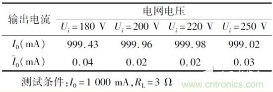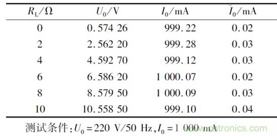 負載穩(wěn)定性測試條件為U0 =220 V/50 Hz,I0 =1000 mA,測試數(shù)據(jù)如表2 所示,其中負載穩(wěn)定度是指一定的工作情況下,負載變化引起的輸出電流變化。測試數(shù)據(jù)表明負載在0 ~10 贅變化時,輸出電流最大偏差為0. 99 mA,紋波電流小于0. 05 mA.