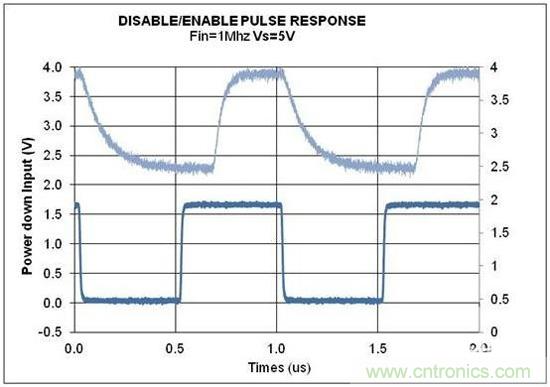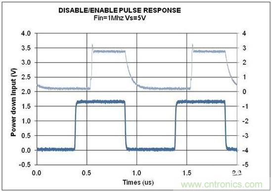 如下圖 2 所示,OPA836具有關斷功能,其開啟/關閉速度相當快,可輕松適應高占空比。