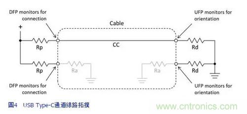 連接裝置之間的初始電力傳輸協(xié)議是透過一系列電阻器執(zhí)行,當(dāng)Type-C插頭插入插座時(shí),這些電阻器充當(dāng)CC線路上的分壓器。由于插頭中的CC線路會(huì)連接至插座中的CC1或CC2,因此插座只要測(cè)量CC1和CC2線路上的電壓,即可判定插頭的方向。上拉電阻的不同數(shù)值可傳達(dá)電源能夠提供的電流量,同時(shí)可確定UFP和DFP分別是什么。電力消耗裝置沒有辦法透過不同的下拉電阻值指出其消耗的電流量,而是必須不斷地調(diào)整其負(fù)載以符合電源供應(yīng)器可提供的最大電流。