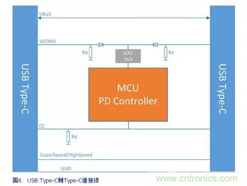 在這些情況下,Dongle成為兩個(gè)裝置間功率協(xié)商的一部分,要求連接線或Dongles具有嵌入式PD控制器。PD控制器最初是透過設(shè)定為5V的Vbus或是Vconn線路供電,接下來會(huì)與主機(jī)協(xié)商,就Vbus線路中的電源功率達(dá)成一致意見。圖6顯示電子標(biāo)記的連接線組件,或EMCA范例,將兩個(gè)Type-C裝置連接在一起。PD控制器的電源可由Vconn1或Vconn2提供。EMCA會(huì)通知其在CC線路上的最大功率容量,電源則會(huì)作出相應(yīng)調(diào)整。
