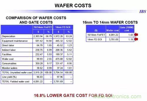 IBS 首席執(zhí)行官Handel Jones則比較了16/14納米FinFET與14納米FD SOI的晶圓成本與單位晶體管成本,根據(jù)他的計(jì)算,14納米FD-SOI工藝單位晶體管成本比相應(yīng)的FinFET工藝低了近17%。