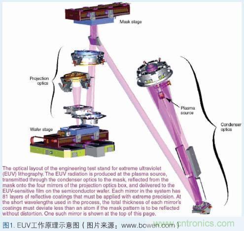 EUV的基本工作原理:激光對準氙氣噴嘴。當激光擊中氙氣時,會使氙氣變熱并產生等離子體;一旦產生等離子體,電子便開始逃逸,從而發(fā)出特定波長的光;接著這種光進入聚光器,然后后者將光匯聚并照到掩膜上;通過在反射鏡的一些部分施加而其它部分不施加吸收體,在反射鏡上形成芯片一個平面的圖案的光學表示,這樣就產生了掩膜;掩膜上的圖案被反射到四到六個曲面反射鏡上,從而將圖像微縮,并將圖像聚投到硅晶圓上;每個反射鏡使光線稍微彎曲以形成晶圓上的圖像,這就像照相機中的透鏡將光彎曲以在膠片上形成圖像一樣。