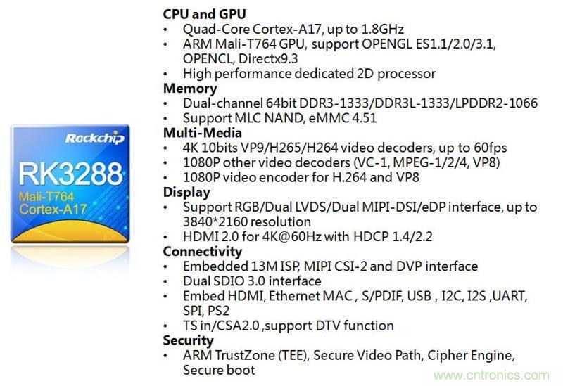 性能方面,RK3288基于28nm HKMG工藝,處理器采用了四核ARM Cortex-A17,主頻達(dá)到了1.8GHz。DDR控制器采用雙通道64bits DDR3/DDR3L/LPDDR2設(shè)計(jì)。GPU采用四核Mali-T7系列GPU,頻率高達(dá)600MHz。該芯片內(nèi)置了2D/3D圖形GPU加速處理器,完美支持OpenGL ES 1.1/2.0/3.1、OpenCL 1.1、DirectX9.3,在3D效果方面相較同類產(chǎn)品有較大的提升。RK3288還支持全部主流視頻格式解碼,支持H.265和4Kx2K分辨率視頻解碼。