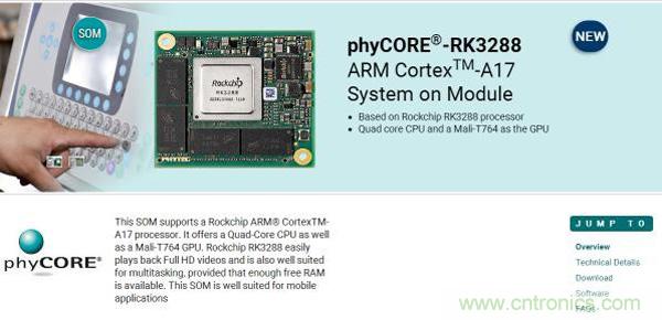 國際知名的處理器及電子技術(shù)型公司Phytec,推出了phyCORE-RK3288 ARM CortexTM-A17 System on Module,采用RK3288 SOM做工控板。根據(jù)Phytec網(wǎng)站資料描述,瑞芯微RK3288 CPU以及GPU性能強(qiáng)大,可輕松應(yīng)對全高清視頻與多任務(wù),非常適用于移動(dòng)應(yīng)用。