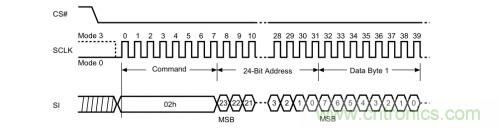 其實(shí),無論是對(duì)芯片的擦除,編程還是讀取操作,我們大致可以按照以下的套路來:寫命令---寫地址---寫(讀)數(shù)據(jù)。正如以下的時(shí)序圖一樣清晰明了,我們先把片選信號(hào)拉低,再發(fā)個(gè)0x02頁(yè)編程命令,再發(fā)個(gè)地址,就可以輕松寫數(shù)據(jù)了。