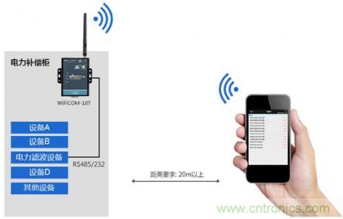 電力補償裝置的巡檢一般需要人工開柜進行數據的查看、調整等操作,工作繁瑣切具有一定危險性,本項目利用WiFiCOM-10T串口轉Wi-Fi模塊,在傳統(tǒng)裝置的基礎上利用原有的RS-485/232通訊接口快速進行產品升級,將串口數據轉化成Wi-Fi信號,巡檢人員即可通過手機或iPad進行設備巡檢,并實現遙控、遙測、遙信等功能。