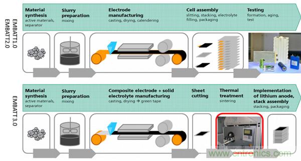 在制造工藝方面,1.0和2.0的制造工藝與現(xiàn)行的鋰離子電池制造工藝沒有明顯區(qū)別,在3.0上,由于采用全固態(tài)玻璃陶瓷電解液,因此電極和電解質(zhì)的裝配可以在同一步驟完成,省卻了后面的注液環(huán)節(jié),但是后續(xù)增加了熱處理環(huán)節(jié),主要是為了讓電極和固態(tài)電解質(zhì)界面更好的接觸。這3.0項(xiàng)目上,全固態(tài)電解質(zhì)的開發(fā)、電解質(zhì)與電極界面兼容性問題是重點(diǎn)研究?jī)?nèi)容,這與一般的固態(tài)電池的研究課題是一致的。