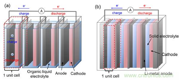下圖對(duì)比了傳統(tǒng)鋰離子電池(a圖)和雙極性鋰電池(b圖,這里是以金屬鋰和全固態(tài)為例)。a圖中,每個(gè)電池單元unit cell包括了正極(一般涂覆在Al基材)、負(fù)極(一般涂覆在Cu基材);b圖中,每個(gè)電池單元unit cell同樣包括了正極、負(fù)極,但是正極、負(fù)極活性材料共用一個(gè)基材:當(dāng)兩個(gè)電池單元串聯(lián)起來時(shí),雙極性電極的一側(cè)在當(dāng)前單元電池作為負(fù)極,另一側(cè)在相鄰單元電池中是作為正極。