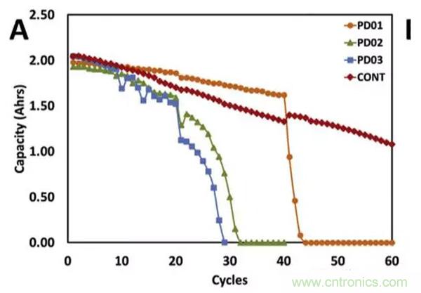 針對三個階段電池的衰降機(jī)理的研究認(rèn)為,階段1可能是因?yàn)殡姵豐EI膜生長需要消耗一部分Li+,因此衰降速度較快。在階段2隨著SEI膜結(jié)構(gòu)的穩(wěn)定,內(nèi)部較為穩(wěn)定,因此衰降速度較慢,在階段3隨著電池老化,開始發(fā)生活性物質(zhì)損失,電極活性界面減少,導(dǎo)致電池對于電流十分敏感。圖C是針對不同的截止電壓對電池衰降速度影響的實(shí)驗(yàn),從實(shí)驗(yàn)結(jié)果可以看到,當(dāng)把充電截止電壓提高到4.3V時會導(dǎo)致電池的循環(huán)性能急劇惡化,降低充電截止電壓可以有效的改善電池的循環(huán)性能。