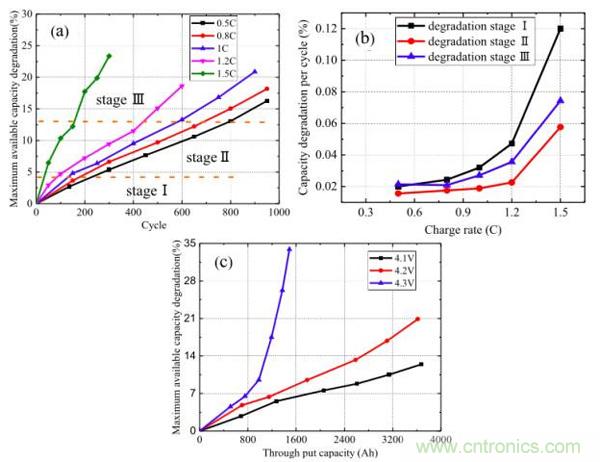 鋰離子電池的放電制度很大程度上依賴于使用者,好的放電制度對于有的使用者而言并不一定適用。但是充電制度則主要是設(shè)計(jì)者進(jìn)行控制,因此對于充電制度對電池壽命衰降的影響的研究,能夠更好的指導(dǎo)我們對鋰離子電池的設(shè)計(jì)。北京交通大學(xué)的YangGao等針對不同的充電制度對鋰離子電池壽命衰降的影響,并研究了其作用機(jī)理,提出了鋰離子電池的壽命衰降模型。YangGao的研究顯示,當(dāng)充電電流和截止電壓超過一定的數(shù)值時,鋰離子電池的衰降將被極大的加速,為了降低鋰離子電池的衰降速率,需要針對不同的體系,選擇合適的充放電電流和截止電壓。