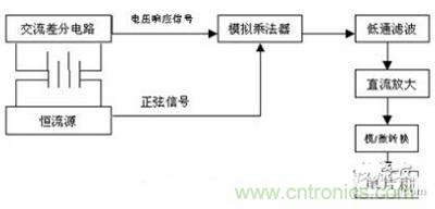 為了解決上述各方法的缺陷,本文采用了四端子測(cè)量方式,將蓄電池兩端上的電壓響應(yīng)信號(hào)通過(guò)交流差分電路與產(chǎn)生恒定交流源的正弦信號(hào)經(jīng)過(guò)模擬乘法器相乘,再將模擬乘法器的輸出電壓信號(hào)通過(guò)濾波電路,使交流信號(hào)轉(zhuǎn)變?yōu)橹绷餍盘?hào),直流信號(hào)經(jīng)直流放大器放大后進(jìn)行模數(shù)轉(zhuǎn)換,將轉(zhuǎn)換后的值送入單片機(jī)進(jìn)行簡(jiǎn)單處理。