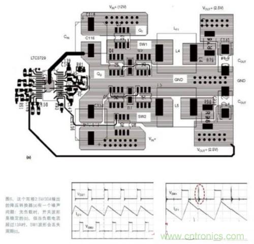 圖6和圖7(略)提供了一個同步降壓電路的例子,它強調(diào)了去耦電容的重要性。圖6a是一個雙相12VIN、2.5VOUT/30A(最大值)的同步降壓電源,使用了LTC3729雙相單VOUT控制器IC.在無負(fù)載時,開關(guān)結(jié)點SW1和SW2的波形以及輸出電感電流都是穩(wěn)定的(圖6b)。但如果負(fù)載電流超過13A,SW1結(jié)點的波形就開始丟失周期。負(fù)載電流更高時,問題會更惡化(圖6c)。