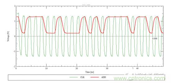 為方便計算,我們假設DDR的時鐘頻率為500MHz,這樣對應的地址信號的速率就應該是500Mbps,這里大家應該明白,雖然DDR是雙倍速率,但對于地址/控制信號來說,依然是單倍速率的。下面來看看波形,在地址與時鐘完全等長的情況下,地址與數(shù)據端的接收波形如下圖2,紅色代表地址信號,綠色代表時鐘信號。