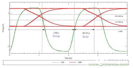 上面的波形我們似乎看不出時鐘與地址之間的時序關系是什么樣的,我們把它放在一個眼圖中,時序關系就很明確了。這里粗略的計算下建立時間與保持時間。如下圖