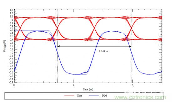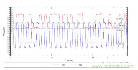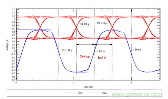 由上圖可知,在地址信號比時鐘信號長的情況下,保持時間為684ps,建立越為1.1ns??梢?,相對于地址線與時鐘線等長來說,地址線比時鐘線長會使地址信號的建立時間更短。同理,如果時鐘線比地址線長,則建立時間會變長,而保持時間會變短。那么雙倍速率的數(shù)據信號又是怎樣的?下面通過具體的仿真實例來看一下。